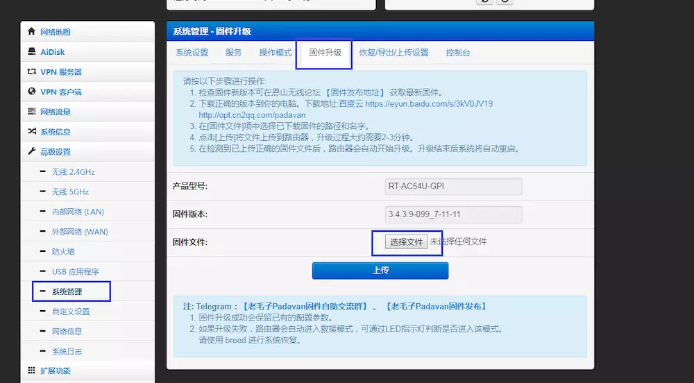登陆成功后,在路由器管理界面中进入固件升级页面,选择padavan固件并升级(固件下载地址:https://opt.cn2qq.com/padavan/MI-3_3.4.3.9-099.trx),如下所示: