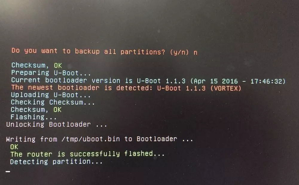 选择“Do you want to backup all partitions?(y/n)”,如果选了y,须等好长一段时间进行备份。这并不是死机,耐心等待即可。
